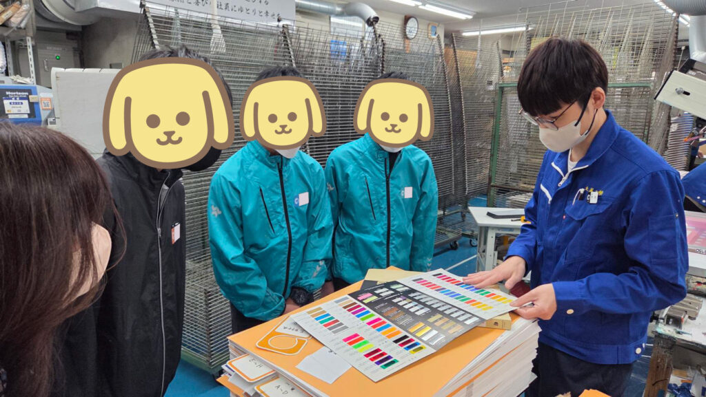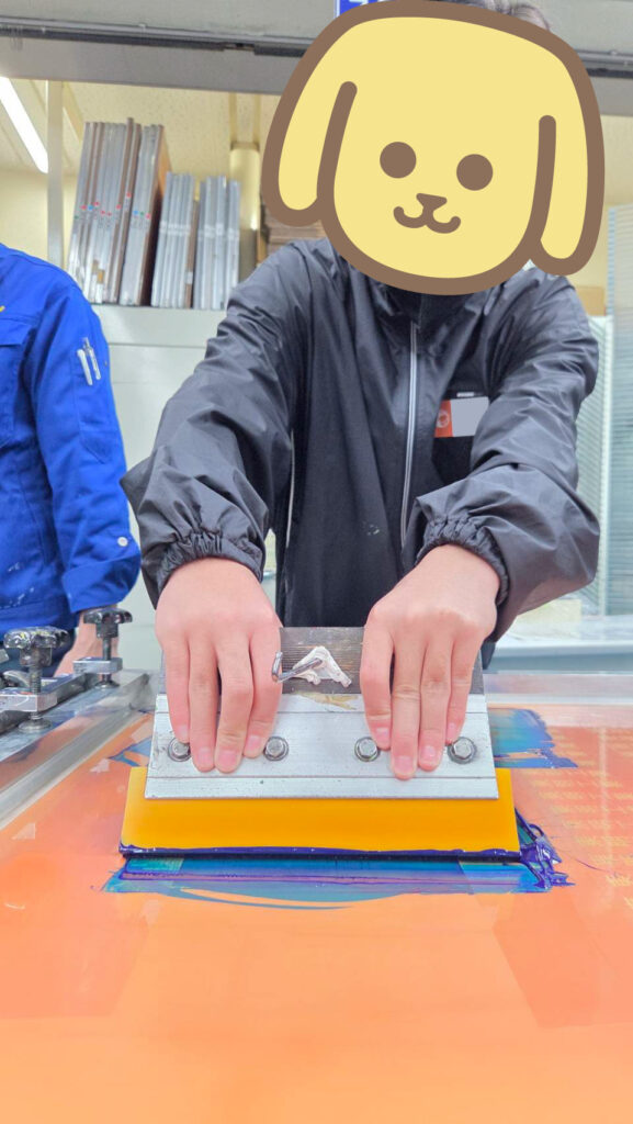 竹内工場長からのスクリーン印刷の仕組みや調色についてのレクチャーからはじまり、実際にスキージを使って手刷りする体験をしてもらいました。